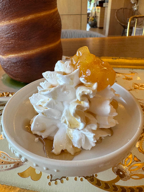 굴뚝빵, 생크림, 아이스 컵을 전부 도자기 그릇으로 사용하는데요.