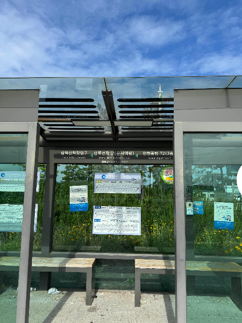 배에서 내려서 정류장에서 버스 타고 인천공항으로 이동하였어요.
